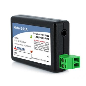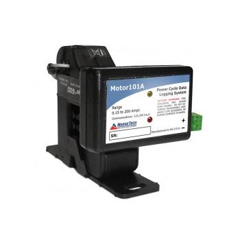 The Motor101A measures and records on and off status changes for motors or other equipment drawing up to 200 Amps. The state change occurs when the current switch exceeds the 150mA set point. This allows for most basic equipment to be monitored. The current switch monitors whether there is current passing through a wire around which it is clamped. When the current exceeds 150mA’s, the output changes and provides a voltage for the Motor101A to measure. The device can hold up to 406,323 state changes, but memory will only be used if the status has changed. The device can be programmed to check for status changes 4 times per second up to once every 24 hours