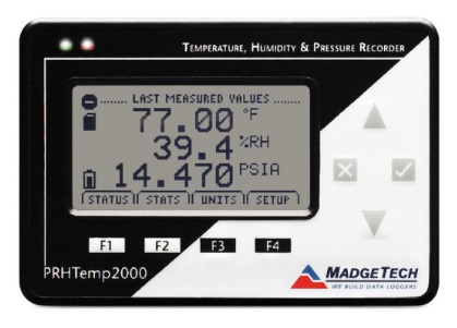 Date and time stamped ºC, ºF, K, ºR; %RH, mg/ml water vapor concentration, dew point; PSIA, inHg, mmHg, bar, mbar, atm, Torr, Pa, hPa, kPa, MPa, inH20, ftH20, mH20, ft alt, m alt |