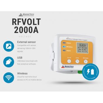 The RFVolt2000A is a wireless data logger designed to measure and record DC voltage signals. The data logger can connect directly to DC voltage sources which makes it ideal for battery usage studies, solar energy monitoring and other DC voltage monitoring applications. The RFVolt2000A can also be interfaced with a wide range of voltage output sensors, including pressure sensors and CO2 sensors, as well as transmitters and other transducers. The RFVolt2000A is available in a 2.5V, 15V, 30V or 160mV measurement range.
