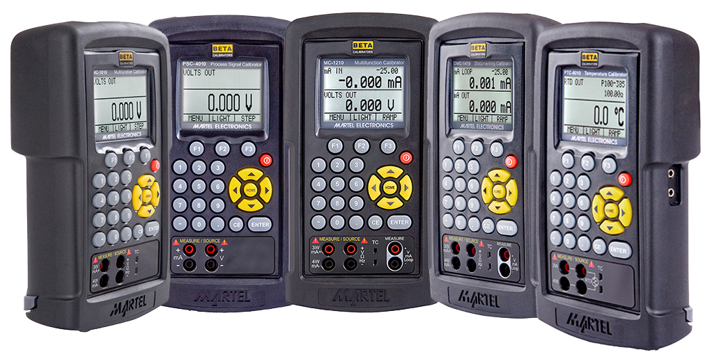 Work better and get better work with Martel TEN series multifunction calibrators. This family of 5 models scale up to do any size job you need when calibrating process instrumentation. Start at the top with the DMC-1410 documenting multifunction calibrator. It’s versatile, providing access to a complete range of calibration functions while performing automated on the fly calibration data collection and storage. A simple easy-to-use software package is included that allows the user to build a database of all assets that need calibration and download work orders to the calibrator. Next in line is the MC-1210 multifunction calibrator. It’s a rugged and reliable universal calibrator. Like all the others in this series, the MC-1210 is based on the proven reliable, accurate and stable MC-1200. It’s dual display and isolated readback allows it to power a transmitter under test while reading its milliamp output. Truly an all-in-one calibrator. The MC-1210 also has a wide range of switch test features for both pressure and temperature switches.